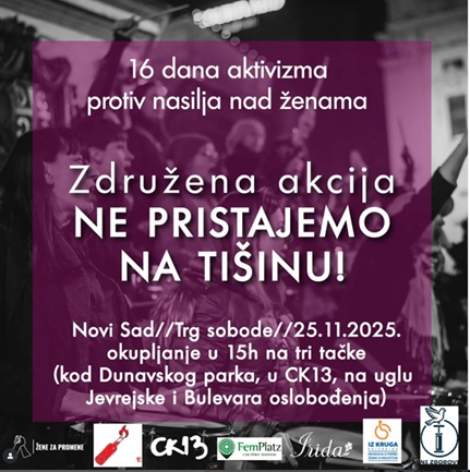 IZ KRUGA VOJVODINA se na poziv grupe ŽENE ZA PROMENE priključila feminističkim organizacijama i savezničkim kolektivima, FemPlatz, Irida, CK13, Kuhinjica solidarnosti i Novosadski zborovi i na Međunarodni dan borbe protiv nasilja nad ženama učestvovala u Združenoj akciji NE PRISTAJEMO NA TIŠINU i istom otpočela Kampanju 16 dana aktivizma protiv nasilja nad ženama.