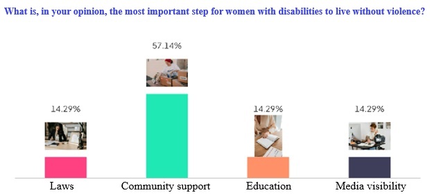 This occasion is a stepping-stone towards better visibility of women with disabilities and towards a society where the right to life without violence is guaranteed to everyone. The participants agreed that it is necessary to improve intersectional cooperation, provide accessible support services, empower women with disabilities to recognize and report violence, and encourage them to get involved in advocacy and policy-making processes. When asked what they think is the most important step for women with disabilities to live without violence, the largest percentage of those present answered THE SUPPORT FROM THE COMMUNITY.